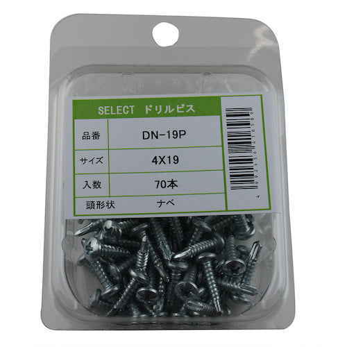 カタログ品番:DN19P 特長:●先端のドリル刃で金属板に直接切り込むことが可能です。 仕様:●寸法(mm)d:4●頭部径(mm):7●全長(mm):19●パック入数(本):70●ユニクロメッキ