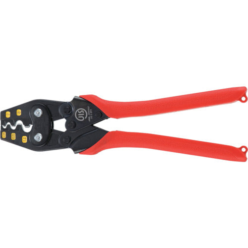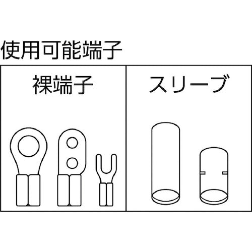 カタログ品番:MH-14 特長:●屋内配線用電線接続工具JIS C 9711適合品です。●安全、確実の品質で圧着作業ができます。●耐久性、連続試験回数3万5千回合格です。●適正な圧着ができるまでダイスが開かない成形確認機構を内蔵しています。●手のひらサイズのミニタイプです。●圧着マークがくっきり鮮明です。●端子仮押さえ機能付です。 用途:●裸圧着端子、スリーブの圧着に。 仕様:●全長(mm):243●圧着端子:裸圧着端子、スリーブ●圧着端子([[MM2]]):1.25、2、5.5、8、14●圧着端子([[MM2]])裸端子用:1.25、2.0、5.5、8.0、14.0 材質/仕上:●本体:スチール●グリップ:エラストマー樹脂