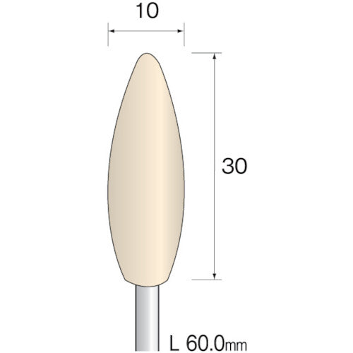 カタログ品番:GA2253 特長:●上質できめ細かい羊毛を高密度に圧縮したバフです。●研磨剤の保持力にも優れ効果的な研磨ができます。 仕様:●タイプ:砲弾型・ソフト●外径(mm):10●幅(mm):30●軸径(mm):3.0●軸長(mm):30●最高使用回転数(rpm):30000●色:白●全長(mm):60.0●適合素材:セラミックス、ガラス、工具鋼、合金鋼、超硬合金、サーメット、一般鋼、ステンレス、アルミニウム、銅