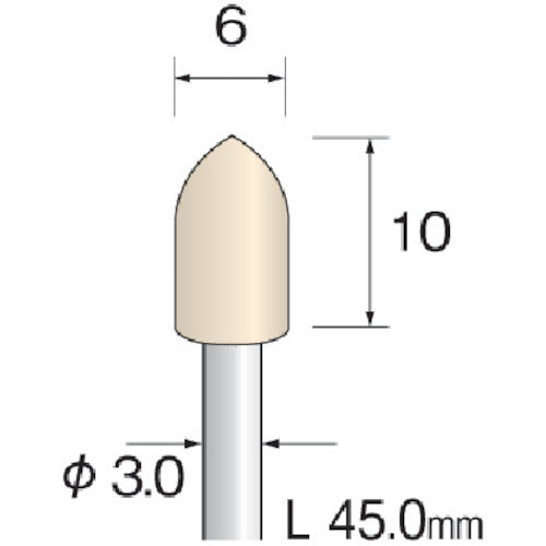 カタログ品番:GA2171 特長:●上質できめ細かい羊毛を高密度に圧縮したバフです。●研磨剤の保持力にも優れ効果的な研磨ができます。 仕様:●タイプ:砲弾型・ソフト●外径(mm):6●幅(mm):10●軸径(mm):3.0●軸長(mm):42●最高使用回転数(rpm):30000●色:白●全長(mm):45.0●適合素材:セラミックス、ガラス、工具鋼、合金鋼、超硬合金、サーメット、一般鋼、ステンレス、アルミニウム、銅