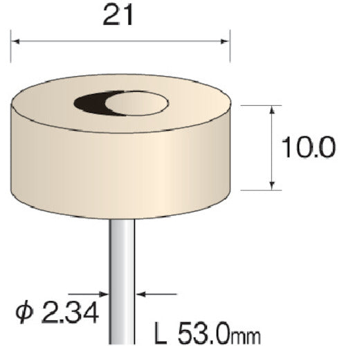 カタログ品番:GA1104 特長:●上質できめ細かい羊毛を高密度に圧縮したバフです。●研磨剤の保持力にも優れ効果的な研磨ができます。 仕様:●タイプ:平型・ハード●外径(mm):21●幅(mm):10●軸径(mm):2.34●軸長(mm):43●最高使用回転数(rpm):15000●色:白●全長(mm):53.0●適合素材:セラミックス、ガラス、工具鋼、合金鋼、超硬合金、サーメット、一般鋼、ステンレス、アルミニウム、銅