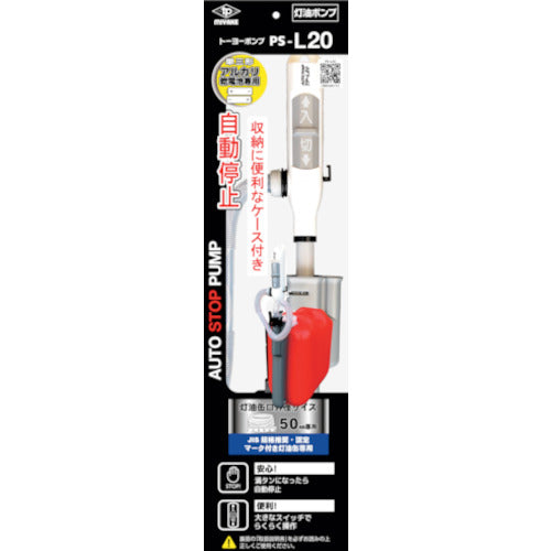 カタログ品番:PS-L20 特長:●満タンで自動停止します。●しずくがたれにくい設計になっています。●スイッチが大きく使いやすい機能的なデザインになっています。 用途:●灯油用。 仕様:●吐出量(L/min):9●全長(mm):700●タイプ:自動停止・収納ケース付●電源(V):単3アルカリ乾電池×2本(別売)●摘要:ポリ缶用●電源:単3乾電池×2本(別売) 材質/仕上:●ポリプロピレン(PP)●ポリエチレン(PE)●ABS樹脂