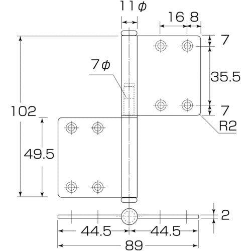 カタログ品番:S-45CH 071 特長:●両面皿で左右兼用です。●簡単施工です。 用途:●扉用蝶番。 仕様:●全長(mm):102●幅(mm):89●厚さ(mm):2●ねじ穴数:8●穴径(mm):6●D2(mm):11●耐荷重(kg)2個使用時:40●木ねじ入数:8●表面処理:ヘアライン仕上げ 材質/仕上:●ステンレス(SUS304) セット内容/付属品:●皿木ねじ3.5×25