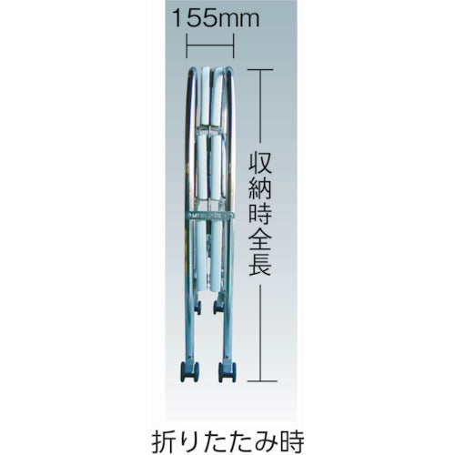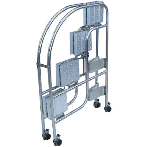 カタログ品番:D504SA 特長:●手すり付きで折りたたみができる踏台です。●瞬時に開閉ができ、折りたたんだ状態で自立するので、簡単に収納できます。●ストッパーをかけると車輪が浮き上がる構造の自在キャスターが付いているので、スムーズに移動できます。●キャスターは荷重がかかると沈み込み、足ゴムが接地するので安全です。 用途:●事務所内などでの作業に。 仕様:●最大使用質量(kg):150●段高(mm):250●天板高さ(m):1●天板寸法(mm):410×240●設置寸法(mm)間口:540●設置寸法(mm)奥行:850●段数(段):4●踏ざん踏面幅(mm):240●収納時全長(m):1.24●完成品●踏ざん踏面幅:240mm 材質/仕上:●踏板:アルミ製(アルマイト処理)●フレーム・ボルト:ステンレス製