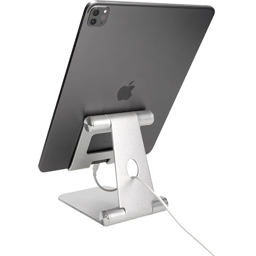 カタログ品番:OWL-STD06-BK 特長:●耐久性の高いアルミニウム素材を採用し、スタイリッシュで高級感のあるデザインに仕上げたタブレット対応のコンパクトな卓上スタンドです。●角度を自由に調整できるため、動画鑑賞にも最適です。●本体との接触部と底面には滑り止めのシリコン付きで滑り落ちるのを防止します。●スタンドに乗せたまま充電可能です。 仕様:●高さ(mm):159●奥行(mm):159●幅(mm):114●色:ブラック●適合機種:12.9インチまでの各種タブレット、スマートフォン●保証期間:初期不良のみ交換保証 材質/仕上:●本体:アルミニウム キズ防止用パッド:シリコン