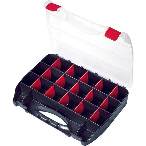 カタログ品番:ORG36DOMCZAPG001 特長:●シンプルで使いやすいケースです。●フタは中身が見易い半透明タイプです。●仕切り板は可変タイプです。 仕様:●色:ブラック(レッド)●外形寸法(mm)間口:364●外形寸法(mm)奥行:268●外形寸法(mm)高さ:66●有効内寸(mm)間口:358●有効内寸(mm)奥行:252●有効内寸(mm)高さ:57●南京錠(別売):取付不可●仕切あり●樹脂製 材質/仕上:●ポリプロピレン(PP) セット内容/付属品:●可変用仕切板:15枚