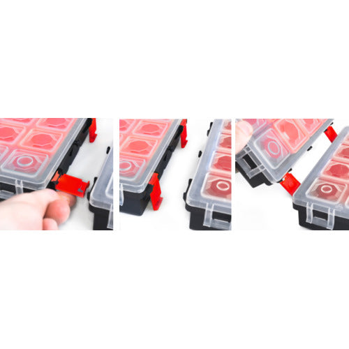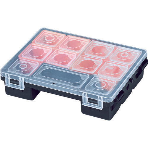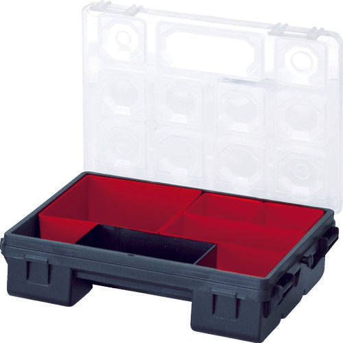 カタログ品番:ORGC200TCZAPG001 特長:●中のボックスは取り外し可能です。●ボックスはフタを閉じると、ケース仕切りで固定され動きません。●同じケースを蝶番で繋ぎ合わせて携帯できます。 仕様:●色:ブラック(レッド)●外形寸法(mm)間口:192●外形寸法(mm)奥行:143●外形寸法(mm)高さ:50●有効内寸(mm)間口:170●有効内寸(mm)奥行:125●有効内寸(mm)高さ:45●南京錠(別売):取付不可●容積(L):3.3●付属ケース:4個●仕切あり●樹脂製 材質/仕上:●ポリプロピレン(PP) セット内容/付属品:●ボックス×4個●蝶番×1セット
