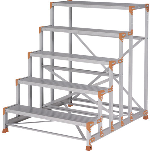 カタログ品番:FGN-5X125 特長:●豊富なラインナップを揃え現場ニーズに応える作業用踏台です。●表面処理が高級感のあるオールアルマイト仕上げです。 用途:●工場・倉庫などでの作業用、高所作業用に。 仕様:●最大使用質量(kg):150●段高(mm):250●天板高さ(m):1.25●天板寸法(mm):1000×400●設置寸法(mm)間口:1018●設置寸法(mm)奥行:1237●段数(段):5●踏ざん踏面幅(mm):200●組立式●踏ざん幅面幅:200mm 材質/仕上:●本体:アルミ合金