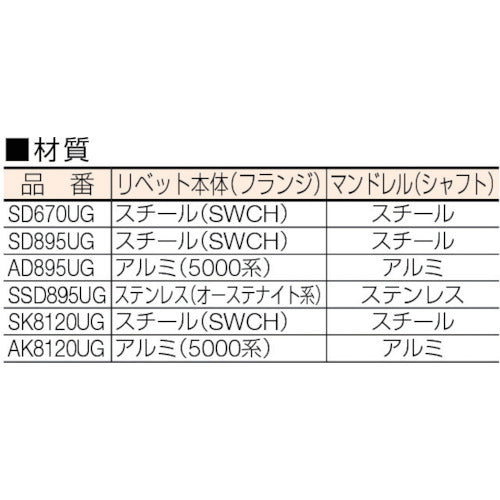 カタログ品番:SD670UG 特長:●振動に強い内部ロック機能を採用した高強度リベットです。●適用板厚が広く、製品の部品点数削減に貢献します。●溶接レスでの構造体組み立てに最適です。 用途:●電気盤・筐体。●車両・架橋トラックなどの振動部接合。●はしご・脚立。●自動倉庫ラック。●立体駐車場。 仕様:●かしめ板厚(mm):1.6〜1.7●リベット長(mm):10.1●フランジ径(mm):9.5●リベット径(mm):4.8●下穴径(mm):4.9〜5.1●せん断荷重(N):6500●引張荷重(N):5330●頭部形状:丸●箱入数(本):2000●箱入●マンドレルヘッド脱落力(N):660 材質/仕上:●鉄