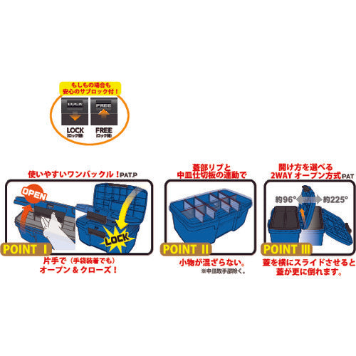 カタログ品番:SDB-475-B 特長:●片手で簡単に開閉が可能でスピーディに作業が可能です。●もしもの時のサブロック付きです。●使いやすいワンバックルで、開け方を選べる2WAY方式です。●中皿の仕切板と蓋裏のリブ構造が連動し、小物も混ざりにくい仕様です。 用途:●収納力抜群で工具の収納に最適。 仕様:●色:ブルー●外形寸法(mm)間口:475●外形寸法(mm)奥行:280●外形寸法(mm)高さ:220●有効内寸(mm)間口:435●有効内寸(mm)奥行:210●有効内寸(mm)高さ:115●南京錠(別売):取付不可●耐荷重(kg):870●中皿付●仕切板8枚付 材質/仕上:●ポリプロピレン