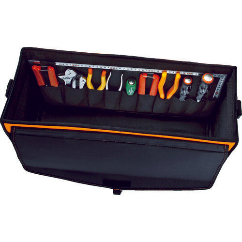 カタログ品番:TBT-5600-OR 特長:●センスが光るデザイン性の高いツールバッグです。●ベストサイズで使いやすいオールマイティツールバッグです。●便利なフタ付です。 用途:●曲尺、鋸などが収納可能。●電動工具、工具の収納。●50センチの曲尺専用スペース付。 仕様:●色:オレンジ●幅(mm):560●奥行(mm):205●高さ(mm):325●外形寸法(mm)奥行:205●外形寸法(mm)間口:560●外形寸法(mm)高さ:325●内ポケット13個付●外ポケット5個付●上フタ付●ショルダーベルト付●ショルダー付 材質/仕上:●ポリエステル