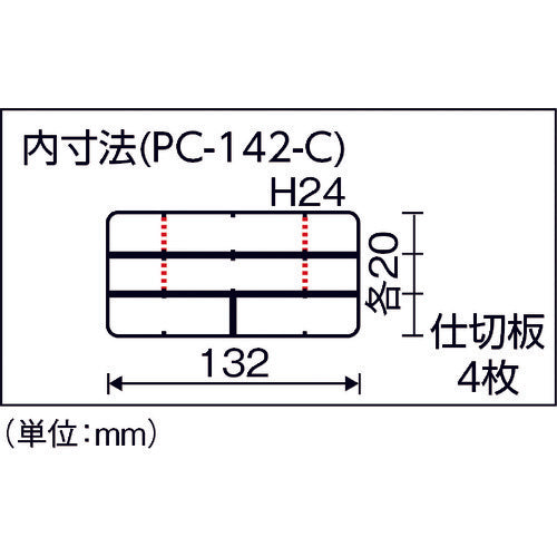 カタログ品番:PC-142-C 特長:●本体、フタ、バックル部分が別部品で耐久性抜群です。●引っ掛かりを軽減するスマートデザインです。●開けやすい本体スリット加工しております。●細かな収納に最適です。●凹凸デザインでフタ表面の傷を軽減します。 用途:●細かいパーツや、文具用品など収納可能。 仕様:●色:クリア●外形寸法(mm)間口:140●外形寸法(mm)奥行:75●外形寸法(mm)高さ:27●有効内寸(mm)間口:132●有効内寸(mm)奥行:60●有効内寸(mm)高さ:24●仕切板(枚):4●タイプ:固定・可動仕切●仕切あり●固定・可動仕切タイプ 材質/仕上:●ポリプロピレン(PP) 注意:●内寸法図の実線は固定仕切で、破線は可動仕切の差込み可能位置です。