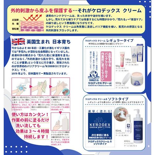 カタログ品番:KERO-S-50 特長:●金属加工油、洗浄液、溶剤、各種化学品、各種接着剤(エポキシ・アクリル樹脂系接着剤など)、消毒液、頻繁な手洗いなどが原因の手・肌アレを予防します(医薬部外品)。●お仕事前に塗るだけ!3〜4時間を目安に塗ることで一日中効果的に肌荒れの原因からお肌を保護します。●従来品の粘度より柔らかいタイプです。●工業関係以外にも病院・介護関係、食品業界でもご使用いただけます。●におい、ベタツキがありませんので、お仕事に支障を与えません。●成分にシリコーン、ステロイド、牛由来成分は含みません。 用途:●工業関係工場、食品工場、病院、厨房、飲食店など、食べ物を扱う作業前の肌荒れ防止に。 仕様:●容量(ml):50●幅(mm):35●奥行(mm):35●高さ(mm):115●容量(g):50 材質/仕上:●主成分:酸化亜鉛(有効成分)、ワセリン、パラフィン、流動パラフィン、セタノール 注意:●眼に入らないように注意して下さい。