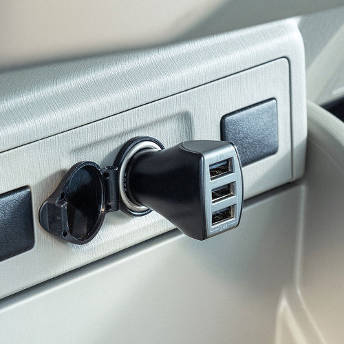 カタログ品番:CAR-CHR79U 特長:●USB充電ポートを3ポート搭載し、スマートフォンやタブレット等を3台同時に充電できるカーチャージャーです。●1ポートあたり最大2.4A、3ポート合計最大4.8Aの出力での充電が可能です。●2ポート以上同時に充電する場合、ポート2、ポート3は2ポート合計で最大2.4Aの出力が可能です。●接続機器を自動認識し、機器に合わせた最大出力で急速充電が行えます。●12V/24V入力に対応し、普通車はもちろん、トラックなどの大型車でも使用できます。 用途:●車内でのUSB充電に。 仕様:●コネクタ(入力):シガープラグ●コネクタ(出力):USBAコネクタメス●定格入力:DC12V/24V●定格出力:DC5V/4.8A●ポート1:最大2.4A●ポート2・ポート3:2ポート合計最大2.4A●USBポート数:3●製品サイズ:W23.5×D72.3×H32.4mm/28g 注意:●ご使用の機種によっては充電できない場合があります。●機種や使用状況によって充電時間に差が出る場合があります。●定格出力以上の出力を要求する機器をせつぞくした場合、充電を中止します。
