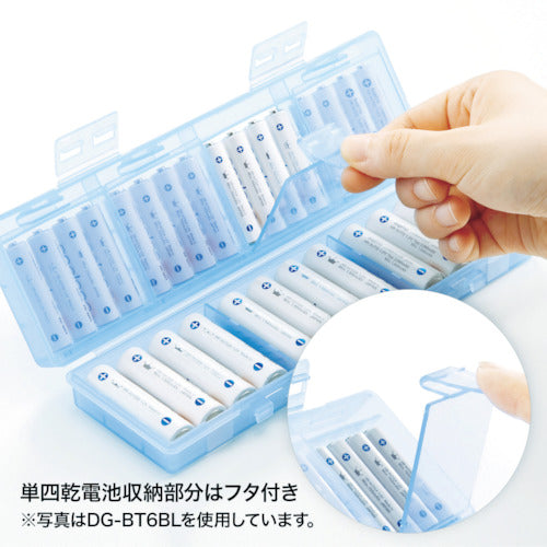 カタログ品番:DG-BT6C 特長:●単3・単4乾電池の両方の収納に対応した電池ケースです。●電池は4本ずつに分けて収納できるので管理に便利です。●スタッキングした際にケースがずれにくい設計です。●充電式電池、未使用乾電池の整理や保管に最適な大容量タイプです。●軽くて割れにくいPP素材を使用しています。 仕様:●幅(mm):205●奥行(mm):66●高さ(mm):33●色:クリア●サイズ(mm):W205×D66×H33●重量(g):約98●材質:PP●収納数(本):12(単3形電池)、16(単4形電池)