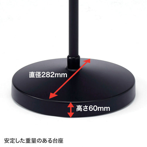カタログ品番:MR-TABST12N 特長:●見やすい高さに調節可能です。●7〜13インチタブレットとiPadmini〜iPadPro対応です。●iPadmini、iPad、iPadAir、iPadPro・タブレット用スタンドです。●使用する高さに合わせて上下に可変でき、任意の位置で固定することができます。●iPad・タブレットを取り付けるホルダーは挟み込みタイプです。●見やすい位置への角度調整ができます。●iPad・タブレットをホルダーに取り付けたままで縦、横の回転が出来ます(360°回転)●ホルダーは取り外しができます。●台座は安定した重量があります。●円盤の高さは60mmです。 仕様:●色:ブラック●幅(mm):282●奥行(mm):282●高さ(mm):900〜1440●耐荷重(kg):1.5●サイズ(mm):φ280×H900〜1470(支柱)●重量(kg):5.5●梱包:1梱包●出荷形態:ノックダウン組立式●材質:本体/スチール(エポキシ粉体塗装)ホルダー/PC●対応機種:iPadmini、iPad、iPadAir、iPadPro、7〜13インチ程度のタブレット(挟み込み200〜240mm、厚さ10mm以下対応) 材質/仕上:●本体:スチール(エポキシ粉体塗装)●ホルダー:ポリカーボネート(PC) 注意:●機器にケースなどを取付けた場合はホルダーに挟み込みが出来ない場合もあります。対応サイズと機器サイズをご確認下さい。