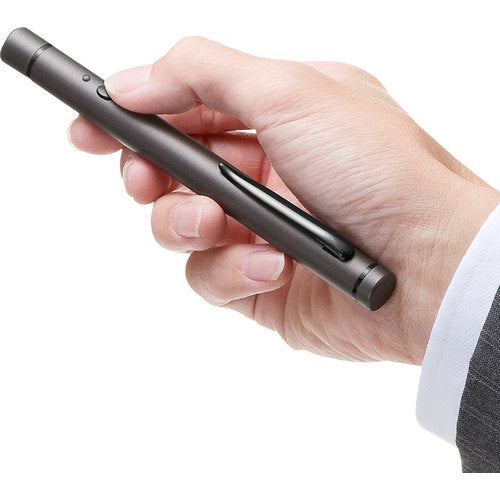 カタログ品番:LP-RD314GM 特長:●明るさ2倍の高輝度レーザー光で的確なプレゼンをできます。●明るさ2倍の高輝度レーザー光で、的確なプレゼンが行えます。●プレゼンの際、手になじんで持ちやすいペン型タイプのレーザーポインターです。●通常使われている一般的な単四乾電池式で経済的です。●赤色の光線が約100m先まで照射できます。(夜間時)●照射中は手元のボタンが点灯するので、暗い場所でも照射しているかどうか一目でわかります。●クリップ付きのスリムサイズ、胸ポケットに入れるなど手軽に持ち運ぶことができます。●消費生活用製品安全法に基づき、PSCマークの認証を受けています。 用途:●プレゼンテーションなどに。 仕様:●外形寸法(mm)直径×長さ:13×156.4●レーザー色:赤色●色:ガンメタリック●到達距離(m):約100(夜間時)●電源:単四乾電池×2本●高さ(mm):144.5●奥行(mm):12.9●幅(mm):12.9●クラス:クラス2(Class2)●レーザー波長(m):635n●レーザー出力:最大1mW●レーザー到達距離:約100m(夜間)※使用環境によって異なります。●連続照射時間:アルカリ電池/約23時間※弊社テスト値であり、保証値ではありません。●サイズ:φ12.9×144.5mm(突起部除く)●重量:約64.7g(電池含む)●付属品:単四乾電池×2本(テスト用)、取扱説明書、保証書 材質/仕上:●真鍮・塗装 セット内容/付属品:●単四乾電池(テスト用)×2、取扱説明書、保証書