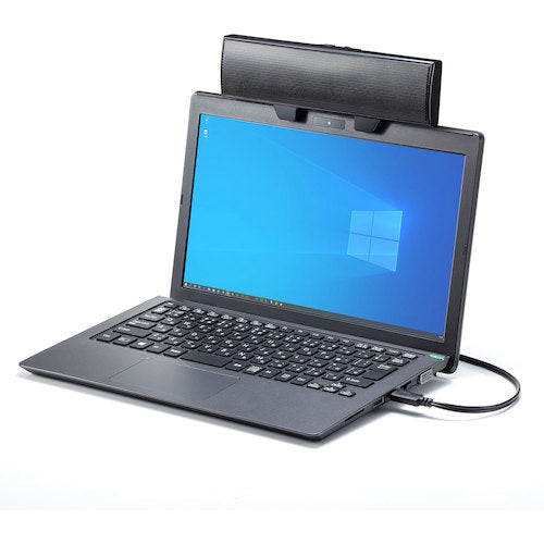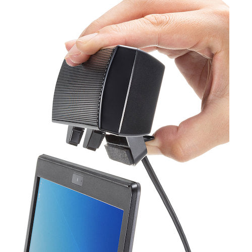 カタログ品番:MM-SPUTC1BK 特長:●Type-Cケーブル1本で電源と音源を供給するUSBスピーカーなのでパソコン周りをキレイに接続できます。●スタンド機能もあるクリップ構造になっており、ノートパソコンの画面上部に挟んで固定したり、モニター下の空いたスペースに設置したりなど2WAYで使用できます。●実用最大出力6W(3W+3W)で左右2つのスピーカーユニットと中央に低音域を強調するパッシブラジエーターを内蔵しています。●コンパクトサイズながら臨場感のある音源を再現できます。●ボリュームコントロールとパワーON・OFFスイッチが分かれているのでスイッチを入れればいつもの音量ですぐに音楽を楽しめます。●マイク内蔵でWEB会議などで使用することもできます。 用途:●パソコン下●スタンド●クリップ 仕様:●幅(mm):203●奥行(mm):36●高さ(mm):65●ケーブル長(m):1.2●実用最大出力:6W(3W+3W)周波数特性:80〜18000Hz●スピーカー形式:密閉型フルレンジスピーカー(非防磁設計)●スピーカーサイズ:1.5インチ(40×40mm)●インピーダンス:4Ω●入力端子:Type-Cコネクタオス(USB2.0・1.1両規格対応)●電源:USBポートより供給(DC5V500mA)●サイズ:W203×D36×H65mm(スピーカー本体)●重量:305g筐体材質:ABS樹脂●ケーブル長:パソコン接続USBケーブル約1.2m●セット内容:本体、取扱説明書(保証書)