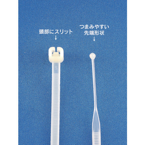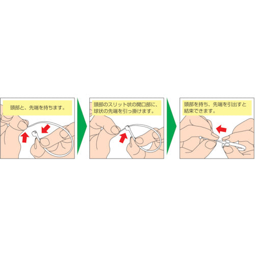 カタログ品番:SG-OH200HD 特長:●頭部のスリット状の開口部に、球状の先端を引っ掛け、手軽に結束できます。●暗闇や手元の見えにくい場所での結束に適しています。 用途:●電線・ケーブルの固定に。 仕様:●色:乳白色●幅(mm):4●長さ(mm):185●厚さ(mm):1.4●最大結束径(mm):44●引張強度(N):196●最小結束径(mm):3●ループ引張強度(N):196●屋内用●使用温度範囲:-40〜85℃●結束後-40℃〜85℃●屋内で使用 材質/仕上:●ポリアミド樹脂(ナイロン66) 注意:●指など身体の一部をしばらないで下さい。●開封後はなるべく早めにご使用下さい。●厳冬期には室温に、しばらく置いてからご使用下さい。