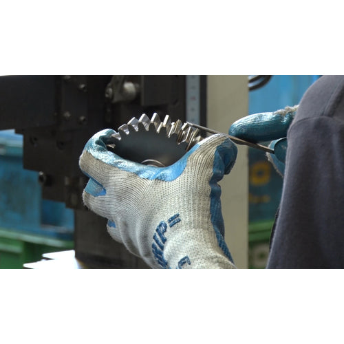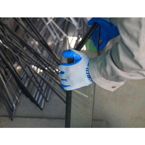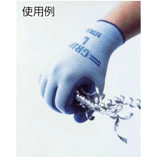 カタログ品番:NO360-M 特長:●耐油性に優れたニトリルゴムを使用しています。●引き裂きに強く、耐摩耗性にも優れています。●独自のすべり止め加工により高いすべり止め効果を発揮します。 用途:●機械工業。●自動車関連。●清掃業。●運送業。 仕様:●色:ブルー●サイズ:M●全長(cm):23.0●手のひら周り(cm):21.0●中指長さ(cm):7.7●厚さ(mm):約1.2●ゲージ数:10●10ゲージ編 材質/仕上:●繊維部:ナイロン、ポリエステル、綿、その他●すべり止め部:ニトリルゴム