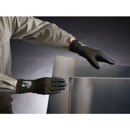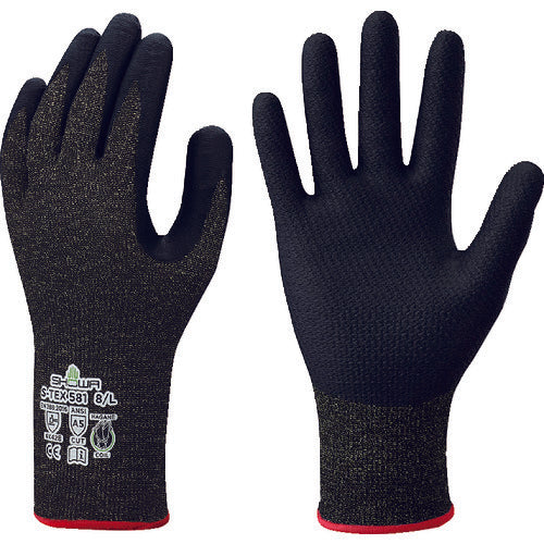 カタログ品番:S-TEX 581-M 特長:●アラミド繊維とステンレスワイヤー糸の混紡で高い切創強度を発揮します。●ガラスやステンレス、アルミなどの対象物に手の跡がつきにくいです。●ゴワつきを抑え、柔らかく手にフィットし、繊細な指先感覚です。●発泡樹脂コーティングで高い透湿性を持たせ、ムレを軽減します。●耐油性・耐摩耗性・耐突き刺し性に優れたニトリルゴムコーティングです。 用途:●ガラス、鉄板、建材など鋭利なワークの取扱いに。●組立や検査など、耐切創性と指先感覚どちらも求められる作業に。 仕様:●色:ブラック●サイズ:M●全長(cm):24.5●手のひら周り(cm):19.0●中指長さ(cm):7.8●ゲージ数:13●EN388 2016規格:4X42E●リストカラー:ブルー●すべり止め:あり●耐切創レベル:X/E●13ゲージ編 材質/仕上:●繊維部:ナイロン、ポリエステル、アラミド、ステンレススティール●すべり止め部:ニトリルゴム