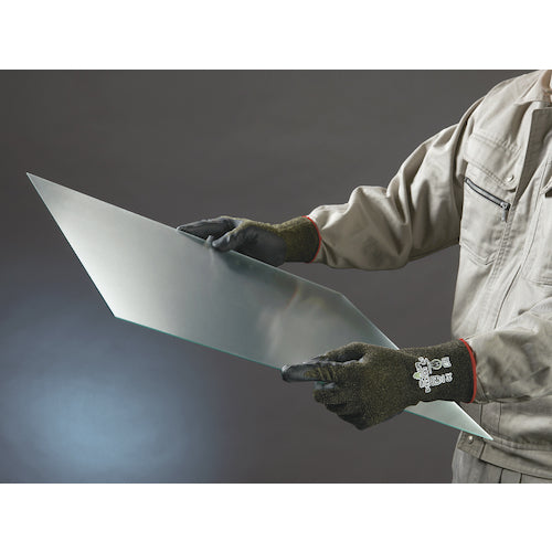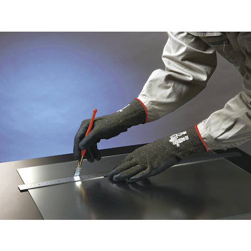 カタログ品番:S-TEX 581-XL 特長:●アラミド繊維とステンレスワイヤー糸の混紡で高い切創強度を発揮します。●ガラスやステンレス、アルミなどの対象物に手の跡がつきにくいです。●ゴワつきを抑え、柔らかく手にフィットし、繊細な指先感覚です。●発泡樹脂コーティングで高い透湿性を持たせ、ムレを軽減します。●耐油性・耐摩耗性・耐突き刺し性に優れたニトリルゴムコーティングです。 用途:●ガラス、鉄板、建材など鋭利なワークの取扱いに。●組立や検査など、耐切創性と指先感覚どちらも求められる作業に。 仕様:●色:ブラック●サイズ:XL●全長(cm):26.5●手のひら周り(cm):22.5●中指長さ(cm):8.2●ゲージ数:13●EN388 2016規格:4X42E●リストカラー:ブラック●すべり止め:あり●耐切創レベル:X/E●13ゲージ編 材質/仕上:●繊維部:ナイロン、ポリエステル、アラミド、ステンレススティール●すべり止め部:ニトリルゴム