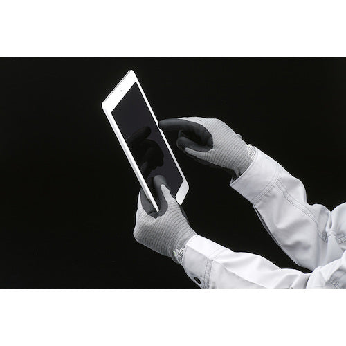 カタログ品番:AC800-XL 特長:●切れにくい繊維を採用した静電気対策手袋です。●繊維部分とコーティング部分ともに導電性を有しているため、作業中の摩擦・接触による帯電を防ぎます。●18ゲージ編みで、薄く手にフィットします。●手のひらにニトリルゴムをコーティングしているため、耐油性・耐摩耗性に優れています。●手袋を着用したままタッチパネルを操作できます。●塗装前の金属製品などへのシリコーン含有物の転写を抑制します。●繊維製品に有害な化学物質が含まれていないことを証明するエコテックス[[R上]]スタンダード100認証を取得しています。 仕様:●色:グレー●サイズ:XL●全長(cm):26.0●手のひら周り(cm):21.5●中指長さ(cm):8.4●ゲージ数:18●すべり止め:あり●18ゲージ編●EN 388:2016規格:4X42D 耐切創レベル X/D●EN16350規格品 材質/仕上:●樹脂部:ニトリルゴム●繊維部:ポリエチレン、ナイロン、その他 注意:●耐切創強度のある繊維を使用していますが、全く切れないものではありません。●刃物や鋭利なもの等に直接触れる場合は、十分注意して使用してください。●使用条件により耐切創性が異なります。●事前に安全性を確認のうえご使用ください。●体質によっては、かゆみ・かぶれ・発疹等をおこすことがあります。