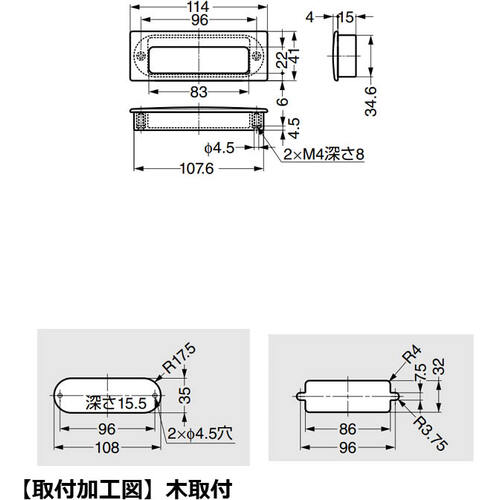 カタログ品番:HH-K 特長:●板金取付けはカップを挟んで取り付けができます。 用途:●カバー、キャビネットに。 仕様:●幅(mm):114●奥行(mm):19●高さ(mm):41●穴径(mm):M4●取付ピッチ(mm):96●板金対応板厚:2mm以下 材質/仕上:●ステンレス(SCS14) セット内容/付属品:●十字穴付トラス小ねじ:厚さ2mm板金用(M4×10)、厚さ20mm木製用(M4×15) 注意:●※板金製扉の場合は本体とカップで挟んで使用します●(使用扉厚:2mm以下)