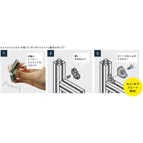 カタログ品番:PJ-60AT 特長:●ナットが不要、位置決め不要、ねじ1本でアルミフレームを簡単にジョイントできるので、作業時間が短縮できます。●付けたい位置に直接取り付けでき、後付けが可能です(下記取付手順参照)●各社アルミフレームに幅広く使用できます(一部使用できないものもあります)●組み立てたアルミフレーム同士を導電状態にするタイプもあります。●PJ-80HA、PJ-100HAは、ジョイントカバーの向きを変えることにより、5mmのパネルを取り付けできます(ねじ穴付仕様をお選びください) 用途:●アルミフレーム専用パーツ。 仕様:●幅(mm):22●長さ(mm):55●かみ合わせ幅(mm):1.0〜3.0●ねじ寸法:M6×16●側面穴径:M4●A(mm):10●適合溝幅(mm):6●後付タイプ 材質/仕上:●ジョイントカバー:アルミ合金●インナージョイント:鋼 注意:●結合するフレームは同じ寸法・形状のものを使用してください●適用フレーム寸法は参考です●現品にてご確認ください●推奨締め付けトルクは取付条件により異なりますご使用の際、試験を行いトルク値を決めてください●画像は同シリーズのいずれかの製品であり、こちらの品番のものとは外観が異なる可能性があります。