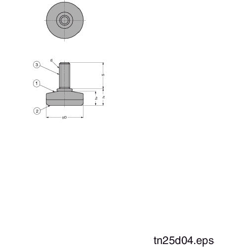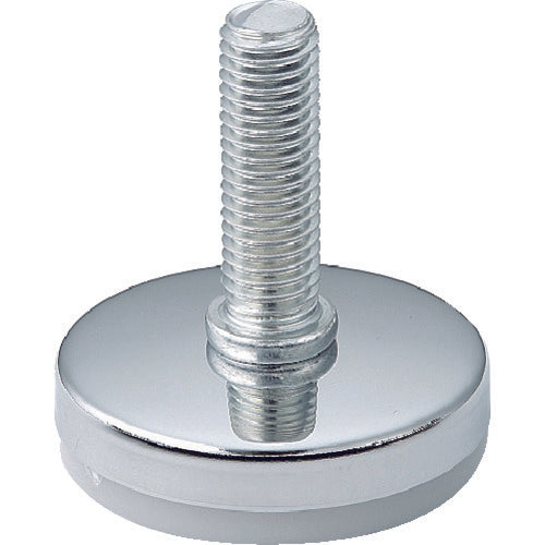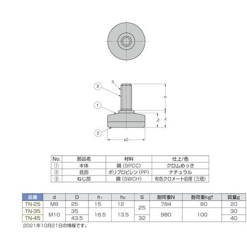 カタログ品番:TN-45 特長:●底部はポリプロピレン製で、底面を傷めません。 用途:●計測機器・事務機器に。 仕様:●許容荷重(kgf):100●ねじ寸法:M10●ねじ長さ(mm):32●全高(mm):48.5●台座径(mm):43.5●色:シルバー色●幅(mm):43.5●耐荷重980N(100kgf) 材質/仕上:●ねじ:スチール(SWCH)●台座:スチール(SPCC)●底部:ポリプロピレン(PP)