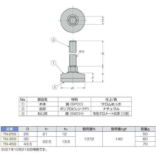 カタログ品番:TN-25S 特長:●底部はポリプロピレン製で、底面を傷めません。 用途:●計測機器・事務機器に。 仕様:●許容荷重(kgf):140●ねじ寸法:M10●ねじ長さ(mm):60●全高(mm):81.0●台座径(mm):25●色:シルバー色●幅(mm):25●耐荷重1372N(140kgf) 材質/仕上:●ねじ:スチール(SWCH)●台座:スチール(SPCC)●底部:ポリプロピレン(PP)