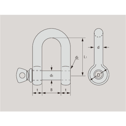 カタログ品番:SUSNGS10T 特長:●JIS規格シャックルより口幅が広く、汎用性が高いシャックルです。●ステンレス製なので錆に強いです。 用途:●土木、建築工事などでの荷物の荷役・連結金具として使用 仕様:●基本使用荷重(t):0.3●ねじ径:M10●寸法(mm)B:20●寸法(mm)t:10●寸法(mm)d3:10●寸法(mm)d:10●寸法(mm)D:19●寸法(mm)L:45●並シャックル●ステンレス品 材質/仕上:●ステンレス 注意:●使用荷重以下でご使用下さい。