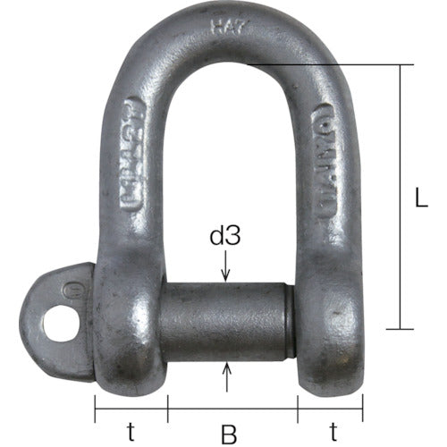 カタログ品番:SD-16 特長:●スタンダードなシャックルです。●サイズが豊富でいろいろな用途でご使用いただけます。●口幅が広く汎用性が高いシャックルです。 用途:●土木、建築工事などでの荷物の荷役・連結金具として使用 仕様:●基本使用荷重(t):1●寸法(mm)B:32●寸法(mm)t:16●寸法(mm)d3:20●寸法(mm)D:36●寸法(mm)L:64●寸法(mm)d1:21●捻じ込みタイプ●ストレートタイプ●生地品 材質/仕上:●スチール(SS400)●表面処理:クロ(メッキなし) 注意:●使用荷重以下でご使用下さい。