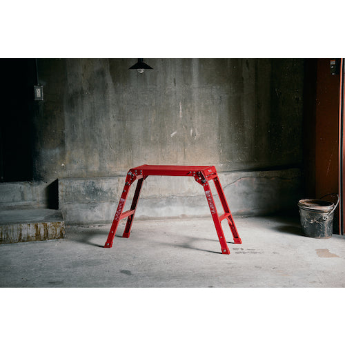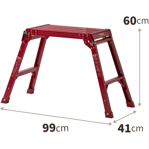 カタログ品番:812004238 特長:●アルミ製で軽く、折りたたみ時はコンパクトに収納できる作業台です。●4箇所ロック、脚部分にすべり止め付き、安全性基準をクリアしたSGマークも付いており、安心してお使いいただけます。 用途:●簡易作業台として。●小物や植物を置くディスプレイラックとして。 仕様:●最大使用質量(kg):100●天板高さ(m):0.6●天板寸法(mm):515×300●収納時寸法(mm)全長:690●収納時寸法(mm)幅:410●収納時寸法(mm)厚さ:140●踏ざん踏面幅(mm):38●SGマーク:認定●色:レッド●段数(段):2●本体サイズ(mm):990×410×600●室内用 材質/仕上:●ステップ:アルミニウム合金、フレーム:アルミニウム合金、止め金具:スチール、ネジ:スチール、すべり止め:塩化ビニル樹脂 注意:●耐荷重100kgのため、それ以上では使用しないでください。