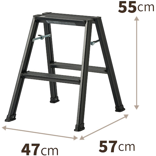 カタログ品番:812004245 特長:●アルミ製で軽く、折りたたみ時はコンパクトに収納できる踏み台です。●カバー付きのストッパーでラクラク開閉、踏み台部分がワイドで安全です。●脚部分にすべり止め付き、安全性基準をクリアしたSGマークも付いており、安心してお使いいただけます。 用途:●踏み台として。●小物や植物を置くディスプレイラックとして。 仕様:●最大使用質量(kg):100●天板高さ(m):0.55●天板寸法(mm):285×170●段数(段):2●収納時寸法(mm)全長:620●収納時寸法(mm)幅:470●収納時寸法(mm)厚さ:170●踏ざん踏面幅(mm):78●色:ブラック●本体サイズ(mm):470×570×550●SGマーク:認定●室内用 材質/仕上:●本体:アルミニウム合金 、ストッパー金具・ネジ:スチール 、ストッパーキャップ:ポリエチレン、天板・踏みざんキャップ:ポリプロピレン、すべり止め:塩化ビニル樹脂 注意:●耐荷重100kgのため、それ以上では使用しないでください。