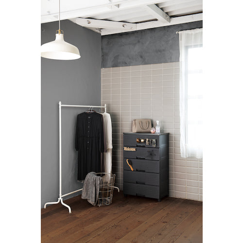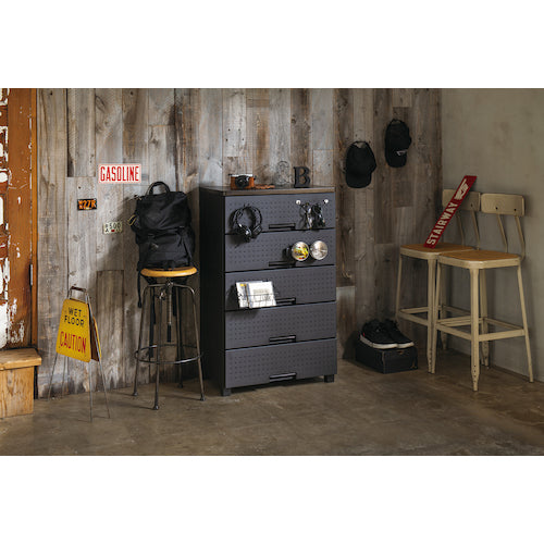カタログ品番:110013908 特長:●前パネルがペグボード仕様になったタイプです。●ペグボードを使って、様々な場所に合わせて『飾る・見せる収納』が楽しめます。●引き出しはあんしんロック付きで、移動時などの不意な飛び出しを防止します。●軽くて丈夫なハニカム構造天板を採用しています。●脚部は床面を傷つけにくい滑り止め付きです。 仕様:●引出し数:5●色:ブラック●間口(mm):650●奥行(mm):410●高さ(mm):1050●引出し内寸(mm)間口:570●引出し内寸(mm)奥行:345●引出し内寸(mm)高さ:150●引出し耐荷重(kg):5●天板耐荷重(kg):10●W65×D41×H105 材質/仕上:●天板:プリント化粧木質繊維板●前パネル:スチロール●引出し・外枠・ロック・ローラー・脚:ポリプロピレン●すべり止め:ポリエチレン
