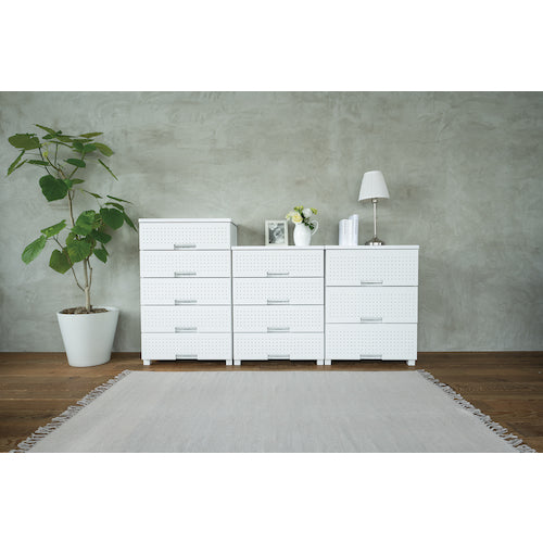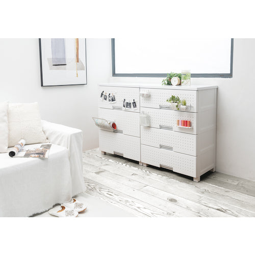 カタログ品番:110013903 特長:●前パネルがペグボード仕様になったタイプです。●ペグボードを使って、様々な場所に合わせて『飾る・見せる収納』が楽しめます。●引き出しはあんしんロック付きで、移動時などの不意な飛び出しを防止します。●軽くて丈夫なハニカム構造天板を採用しています。●脚部は床面を傷つけにくい滑り止め付きです。 仕様:●引出し数:3●色:ホワイト●間口(mm):650●奥行(mm):410●高さ(mm):850●引出し内寸(mm)間口:565●引出し内寸(mm)奥行:340●引出し内寸(mm)高さ:215●引出し耐荷重(kg):5●天板耐荷重(kg):10●W65×D41×H85 材質/仕上:●天板:プリント化粧木質繊維板●前パネル:スチロール●引出し・外枠・ロック・ローラー・脚:ポリプロピレン●すべり止め:ポリエチレン