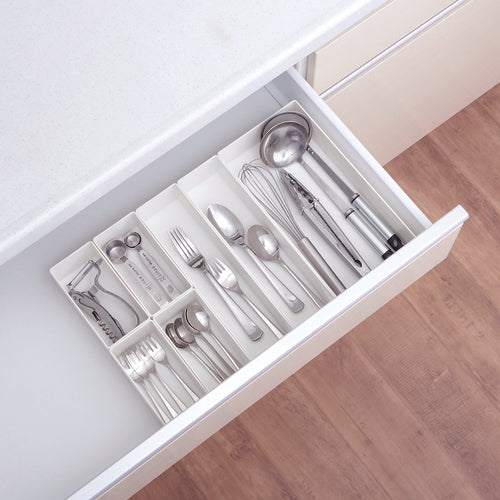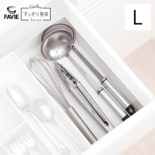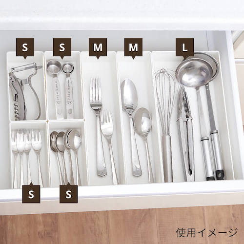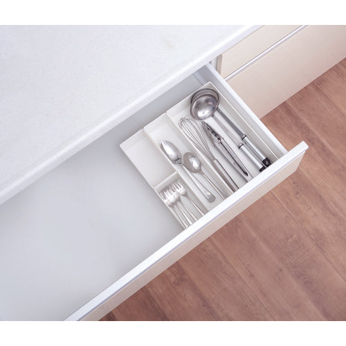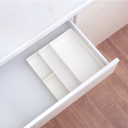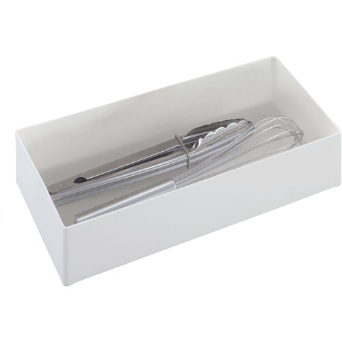 カタログ品番:811000666 特長:●細々したカトラリーやキッチン小物を分けて収納できます。●お玉やフライ返しなど大きめの調理器具の収納におすすめです。●角が丸いので、汚れても拭きやすくお手入れしやすいのが特長です。 仕様:●幅(mm):150●奥行(mm):300●高さ(mm):70●色:ホワイト 材質/仕上:●本体:ABS樹脂●ジョイント部品:ポリプロピレン(ジョイント各アイテムにつき2個ずつ付属)