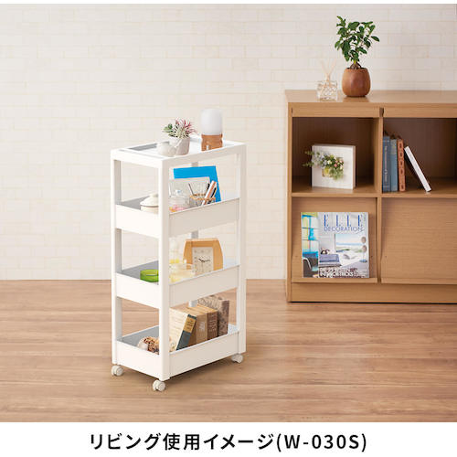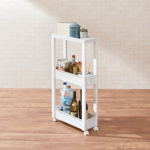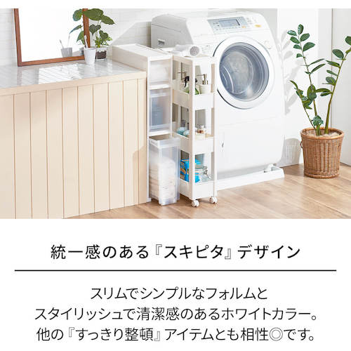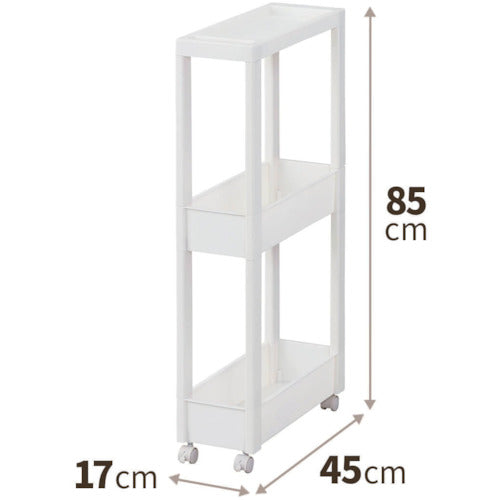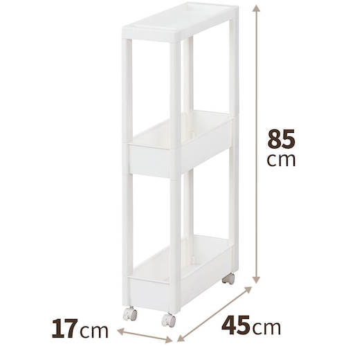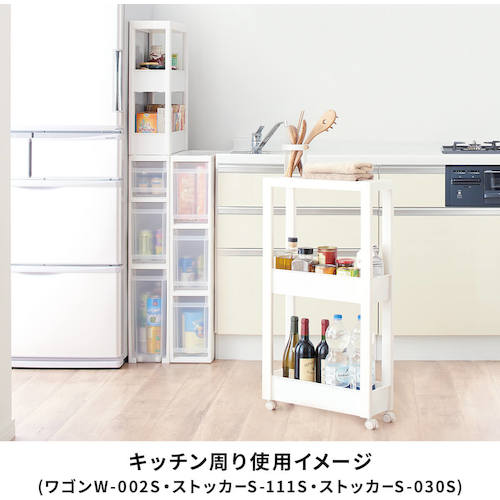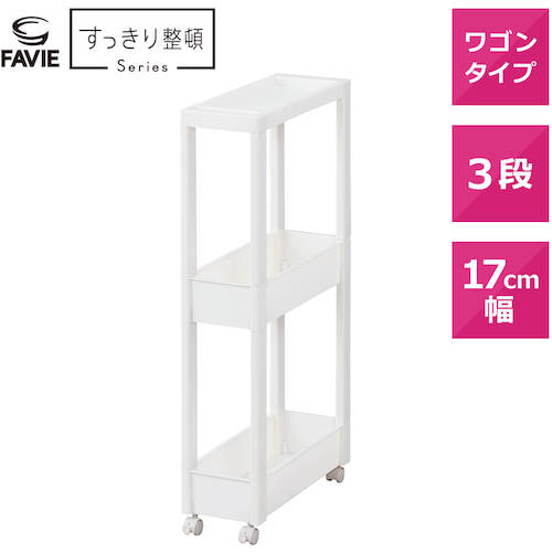 カタログ品番:811000972 特長:●スクエア柱、ハンドルを内側に納めたスッキリ形状天板により、ストッカーとコーディネートできるデザインにしました。●フラットなデザインのストッカーやボックスと組み合わせて使っても、相性抜群です。●差し込み式キャスター付きです。●スタイリッシュなホワイトカラーで、キッチンや洗面所などあらゆるシーンでのストック収納におすすめです。●幅17cmのスリムタイプです。 仕様:●耐荷重(kg/台):8●耐荷重(kg/段):2●段数(段):3●色:ホワイト●外形寸法(mm)間口:170●外形寸法(mm)奥行:450●外形寸法(mm)高さ:850●有効内寸(mm)間口:128●有効内寸(mm)奥行:403●有効内寸(mm)高さ:88●耐荷重(kg/段)天板:3●耐荷重(kg/段)下:3●高さ(mm):850●奥行(mm):450●耐荷重(kg):8●組立品●キャスター付●積重ね使用:ストッカー(別売)の上に1個まで(※ストッカー5段は不可)●ワゴン容量:5.5L(ワゴンスリム)●棚深さ(mm):88 材質/仕上:●本体:ポリプロピレン(PP)●キャスター:ナイロン・スチール 注意:●ワゴンはストッカーの上に1台まで積み重ね可能です。(ストッカー5段タイプは不可)
