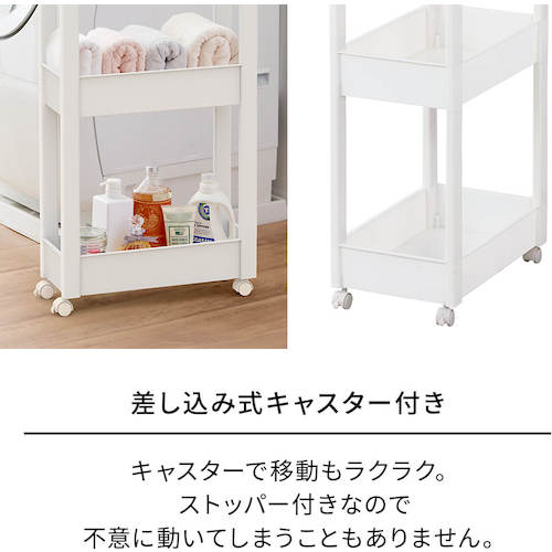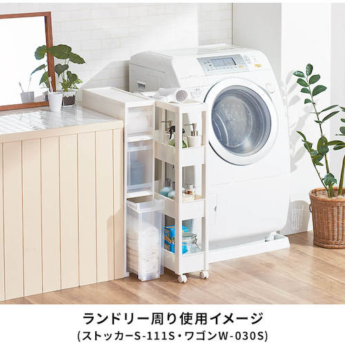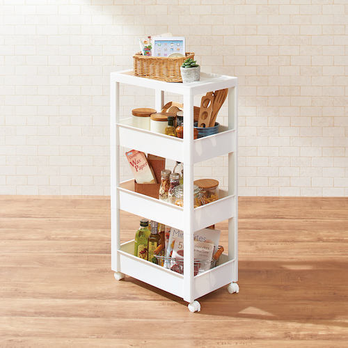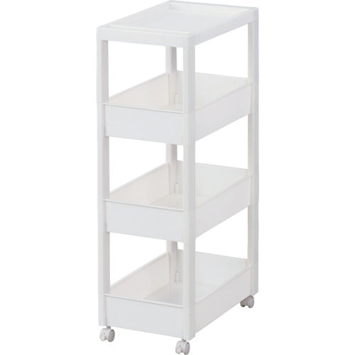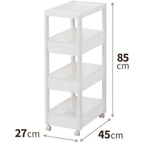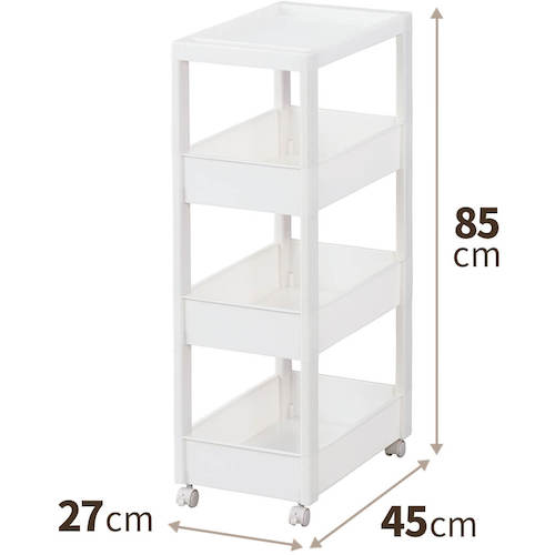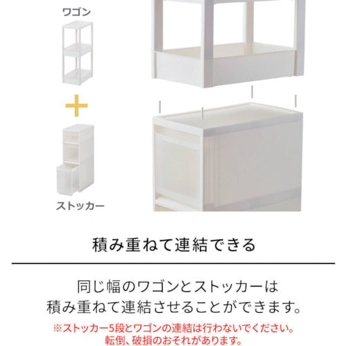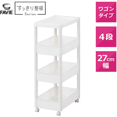 カタログ品番:811000975 特長:●スクエア柱、ハンドルを内側に納めたスッキリ形状天板により、ストッカーとコーディネートできるデザインにしました。●フラットなデザインのストッカーやボックスと組み合わせて使っても、相性抜群です。●差し込み式キャスター付きです。●スタイリッシュなホワイトカラーで、キッチンや洗面所などあらゆるシーンでのストック収納におすすめです。●幅27cmのワイドタイプです。 仕様:●耐荷重(kg/台):10●耐荷重(kg/段):2●段数(段):4●色:ホワイト●外形寸法(mm)間口:270●外形寸法(mm)奥行:450●外形寸法(mm)高さ:850●有効内寸(mm)間口:228●有効内寸(mm)奥行:403●有効内寸(mm)高さ:88●耐荷重(kg/段)天板:3●耐荷重(kg/段)下:3●耐荷重(kg):10●奥行(mm):450●高さ(mm):850●組立品●キャスター付●積重ね使用:ストッカー(別売)の上に1個まで(※ストッカー5段は不可)●ワゴン容量:9.2L(ワゴンワイド)●ワゴン内寸(凸部除く値)(cm):幅22.8×奥行40.3×高さ8.8 材質/仕上:●本体:ポリプロピレン(PP)●キャスター:ナイロン・スチール 注意:●ワゴンはストッカーの上に1台まで積み重ね可能です。(ストッカー5段タイプは不可)