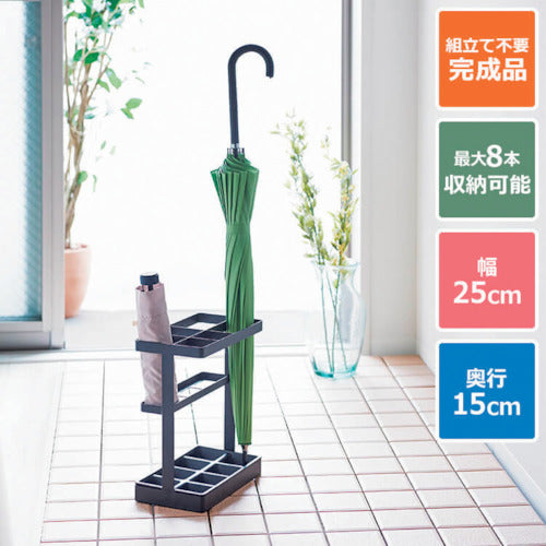 カタログ品番:811000574 特長:●最大8本収納可能です。●折りたたみ傘も収納できる中段付きです。 仕様:●間口(mm):250●奥行(mm):150●高さ(mm):310●色:マットブラック●傘本数(本):8●収納の目安:最大で約8本●最大外寸(約):幅25×奥行15×高さ31(cm) 材質/仕上:●本体:スチール(粉体塗装)●樹脂部分:ポリプロピレン●クッション:EVA樹脂