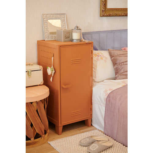 カタログ品番:110013845 特長:●側面にペグボードが付いた飾れる「樹脂製ロッカー型収納」です。●市販のペグボード部品を使って側面をカスタマイズできます。●棚の高さは4段階に変更可能です。 仕様:●色:オレンジ●間口(mm):355●奥行(mm):355●高さ(mm):765●W35.5×D35.5×H76.5●棚板1枚 材質/仕上:●本体・脚:スチロール樹脂、ポリプロピレン