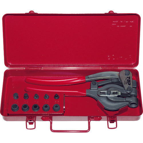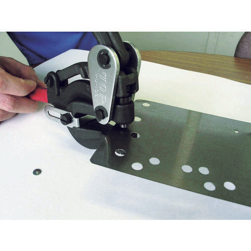 カタログ品番:PU-105 特長:●板金・レザーなどの穴あけに使用できます。●返りバリができず、きれいに穴あけができます。●本体はオール鍛造品で熱処理済のため、強靭でゆがみません。 仕様:●セット内容(mm):ハンドパンチ本体・ポンチ:5.5、6.5、7.5、8.5、10.5 ダイス:5.7、6.7、7.7、8.7、10.7●セット内容(点):11●全長(mm):255●適合ポンチサイズ(mm):5.5・6.5・7.5・8.5・10.5●穴抜能力:鉄板1枚:1.6mm、ステンレス材:約1.0mm 材質/仕上:●特殊合金鋼 注意:●ステンレス板の穴開能力は1.0ミリ厚までです。