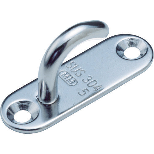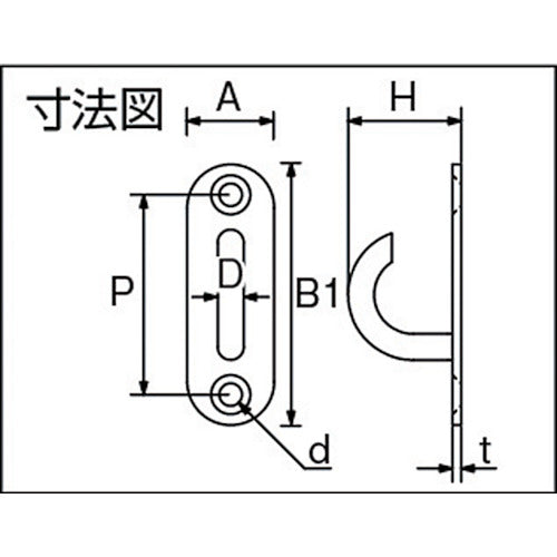 カタログ品番:TOP-5 特長:●設置幅の狭い面でも取り付け可能です。●皿頭のねじをご使用ください。 用途:●支柱や壁面等の取り付けに。 仕様:●吊下荷重(N/kgf):98/10●A(mm):15●D(mm):5●B1(mm):45●H(mm):20●P(mm):35●d(mm):4.2●h(mm):20●T(mm):2●t(mm):2●フック径(mm):5 材質/仕上:●ステンレス(SUS304)
