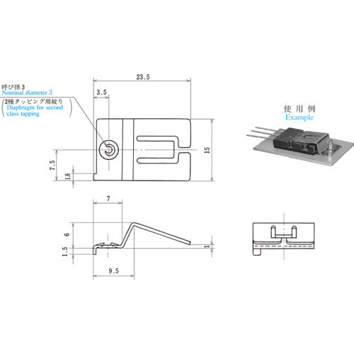 カタログ品番:T9051 特長:●基板端子用アクセサリーです。 仕様:●幅(mm):15●高さ(mm):6●長さ(mm):23.5●摘要:トランジスタクリップ15mm幅 M3タッピングねじ用穴●適合トランジスタ:TO-3P 材質/仕上:●SUS304