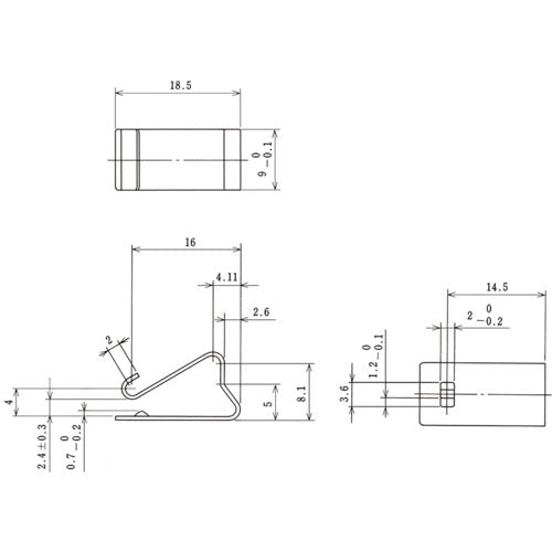 カタログ品番:T9077 特長:●基板端子用アクセサリーです。 仕様:●幅(mm):9●高さ(mm):8.1●長さ(mm):18.5●摘要:トランジスタクリップ SUS●適合トランジスタ:TO-3P 材質/仕上:●ステンレス(SUS304)