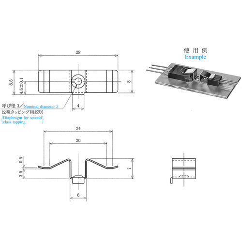 カタログ品番:T9092 特長:●基板端子用アクセサリーです。 仕様:●幅(mm):8●高さ(mm):7●長さ(mm):24●摘要:トランジスタクリップ SUS 2個押さえ●適合トランジスタ:TO-3P 材質/仕上:●SUS304