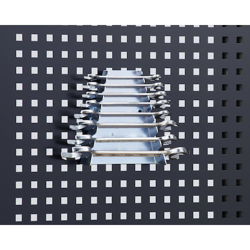 カタログ品番:SF-SPF 特長:●パンチングパネルに取り付けて、小物工具類、各種スパナやレンチなどをフックに引掛けて整理・整頓に最適です。●パンチングパネル付の部品管理ラックやツールワゴンなどに取り付けるのが、有効です。●パネルにフックをかけ、付属のねじを締めていただくと、フックが固定され落下防止になります。●上下方向に並べるのでスパナの出し入れが容易です。 用途:●スパナの管理に。 仕様:●間口(mm):130●奥行(mm):54●高さ(mm):145●ホルダ数(個):8●最大積載量(kg/個):5●許容荷重(kg):5 材質/仕上:●スチール(ユニクロメッキ仕上げ)