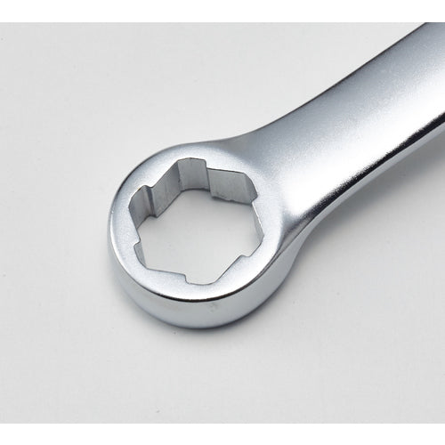 カタログ品番:TBECL-13 特長:●独特な形状デザインにより、90%潰れたネジも掴めます(メガネ部)。●メガネの柄部は曲がり角度15°と小さいので高さ制限を受ける箇所の作業に最適です。 仕様:●二面幅寸法(mm):13●全長(mm):242●表面処理:クロムメッキ サテン仕上げ 材質/仕上:●クロムモリブデン鋼(Cr-Mo)●表面処理:クロムメッキ