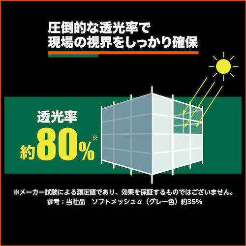 カタログ品番:LCM-1851-TM 特長:●焼却処理時、有害なダイオキシン類の発生がありません。●風合いがしなやかで、シワがつきにくく、現場の美観を引き立てます。●軽くて作業性に優れます。●清涼感のあるホワイトで、採光性・透視性が高く、中で作業をしている方も作業効果が上がります。 用途:●建築工事養生用。●塗装工事用。(飛散防止)●粉じん、ホコリ除け。 仕様:●幅(m):1.8●長さ(m):5.1●厚さ(mm):0.24●ハトメ数(個):46●ハトメピッチ(cm):30●引張強度:縦290N/3cm、横170N/3cm●引裂強度:縦120N、横140N●色:クリア●目合(mm):0.5●厚さ:0.24mm●消防法で定められた防炎物品●目合い(網目の大きさ):0.5mm●防炎表示者認定番号:AFE330085 材質/仕上:●シート:ポリプロピレン(PP)●ハトメ:アルミ(内径:9mm)